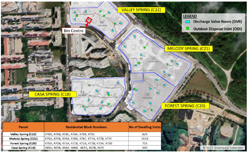 A 2-fraction gravity vacuum PWCS was deployed, enabling residents to dispose of general waste and recyclables via dedicated chutes or 13 outdoor points.