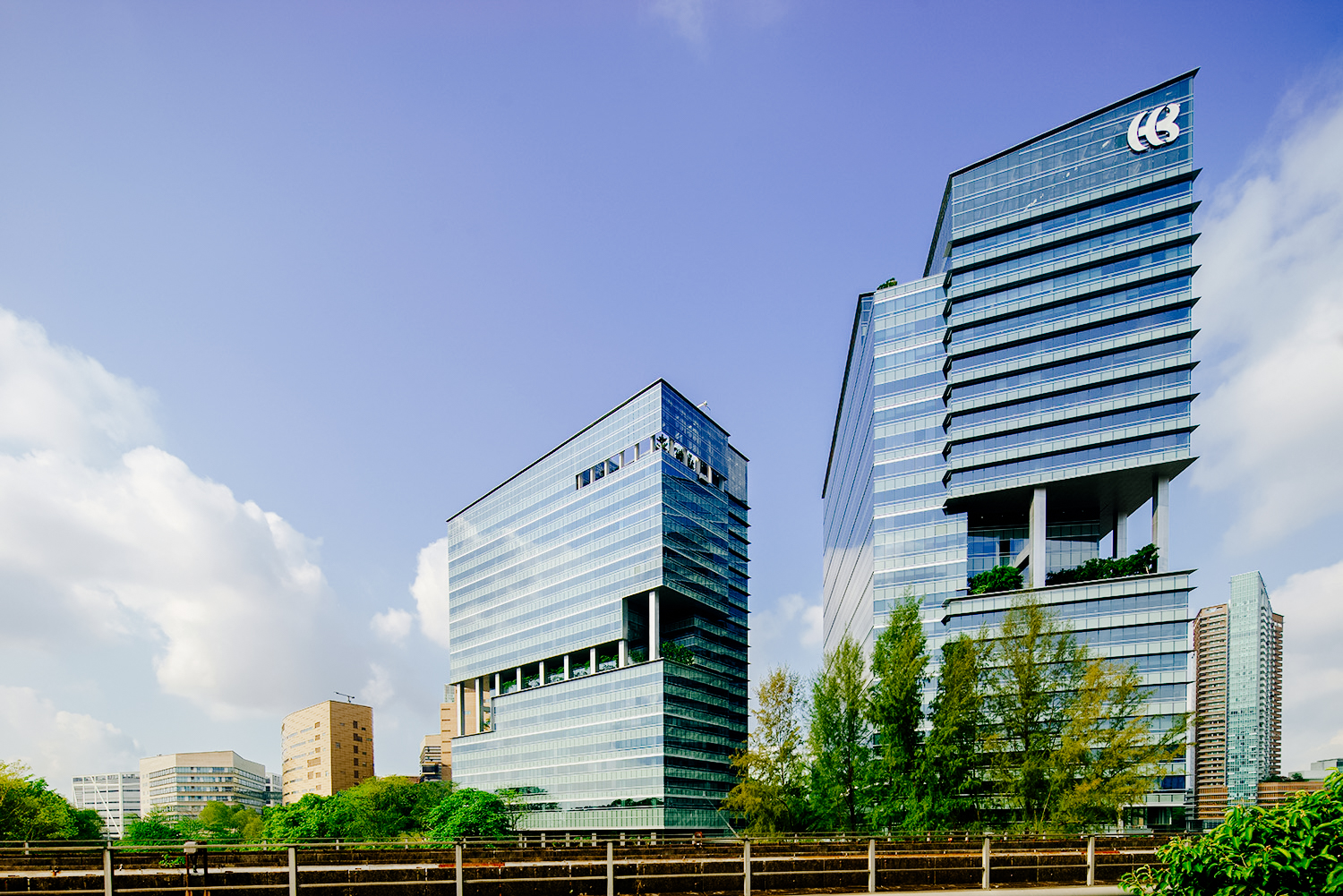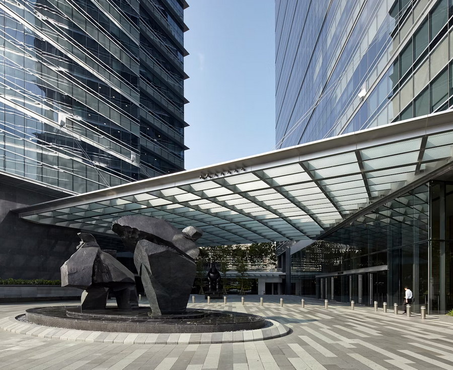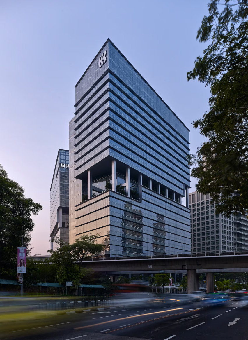 The Metropolis twin towers (23 and 21 storeys) form a Grade-A office complex in Singapore’s one-north district, earning the BCA Green Mark Platinum award for its advanced sustainable design and operations.